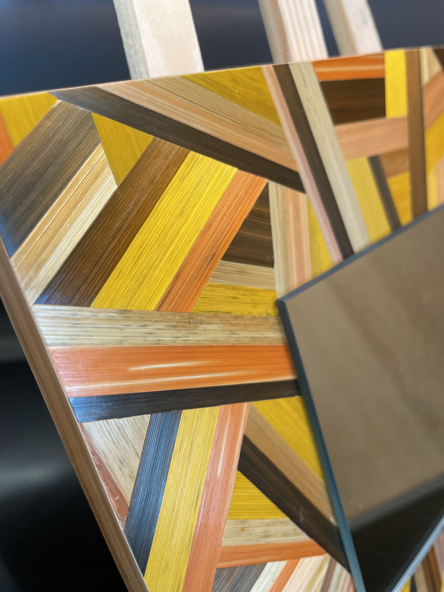 Cet objet est composé de brins de paille teintés, fendus et soigneusement aplatis sur la longueur avec un plioir. Coupés, collés et assemblés bord à bord avec précision... / La Marqueterie de Paille se distingue par sa brillance naturelle riche en silice ou la lumière réfléchissante produit des effets irisant uniques.