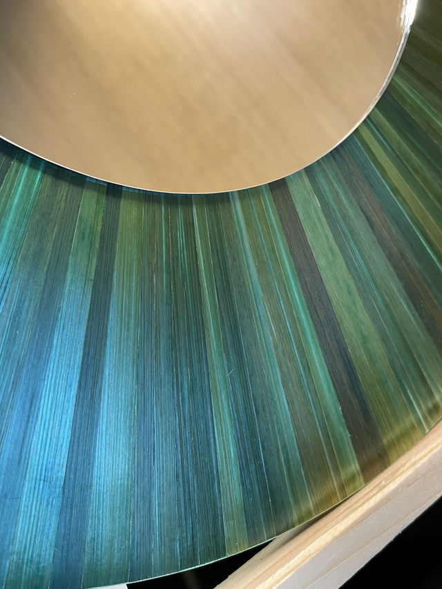Cet objet est composé de brins de paille teintés, fendus et soigneusement aplatis sur la longueur avec un plioir. Coupés, collés et assemblés bord à bord avec précision... / La Marqueterie de Paille se distingue par sa brillance naturelle riche en silice ou la lumière réfléchissante produit des effets irisant uniques.