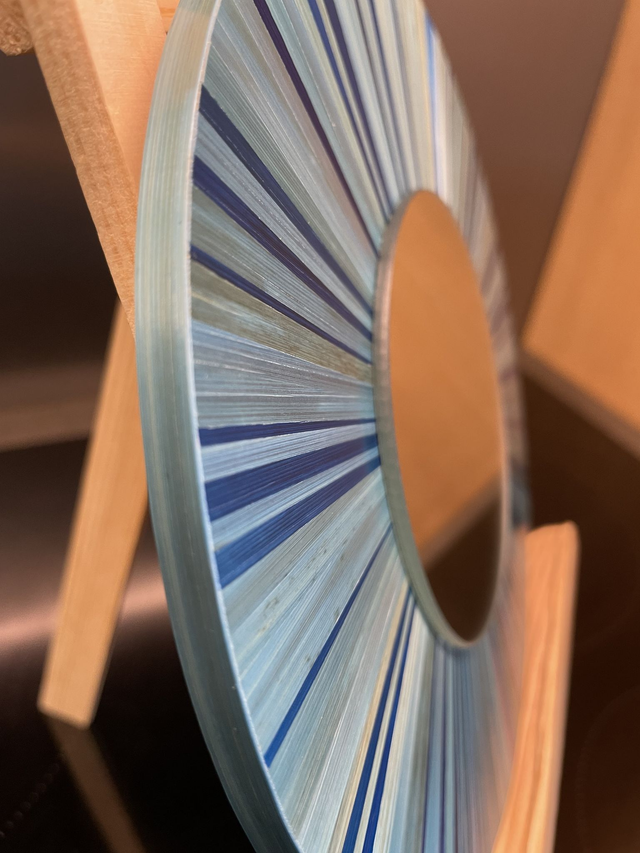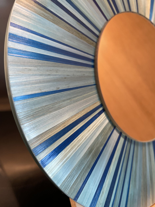 Cet objet est composé de brins de paille teintés, fendus et soigneusement aplatis sur la longueur avec un plioir. Coupés, collés et assemblés bord à bord avec précision... / La Marqueterie de Paille se distingue par sa brillance naturelle riche en silice ou la lumière réfléchissante produit des effets irisant uniques.