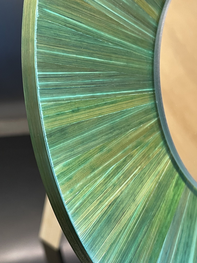 Cet objet est composé de brins de paille teintés, fendus et soigneusement aplatis sur la longueur avec un plioir. Coupés, collés et assemblés bord à bord avec précision... / La Marqueterie de Paille se distingue par sa brillance naturelle riche en silice ou la lumière réfléchissante produit des effets irisant uniques.