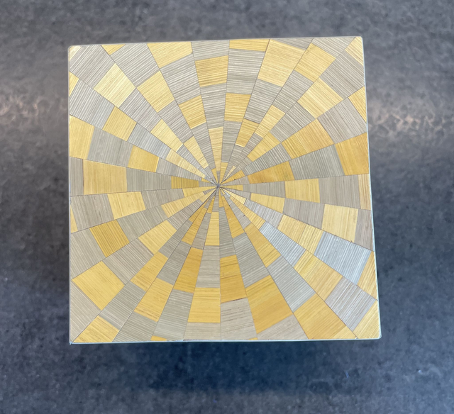 Cet objet est composé de brins de paille teintés, fendus et soigneusement aplatis sur la longueur avec un plioir. Coupés, collés et assemblés bord à bord avec précision... / La Marqueterie de Paille se distingue par sa brillance naturelle riche en silice ou la lumière réfléchissante produit des effets irisant uniques.
