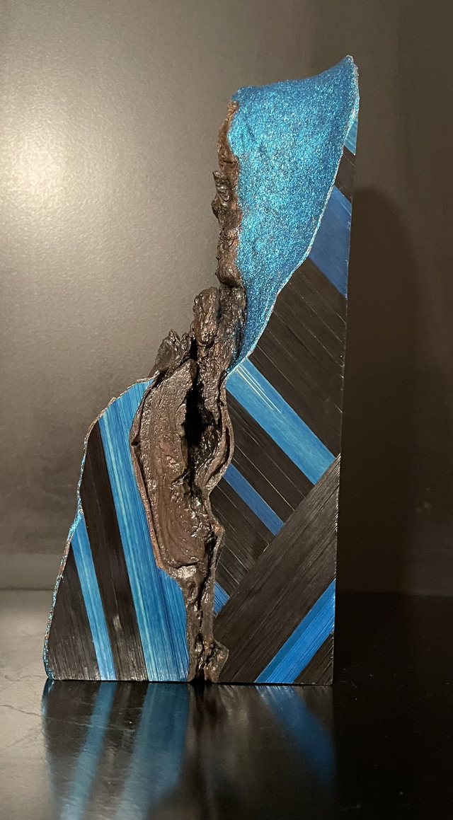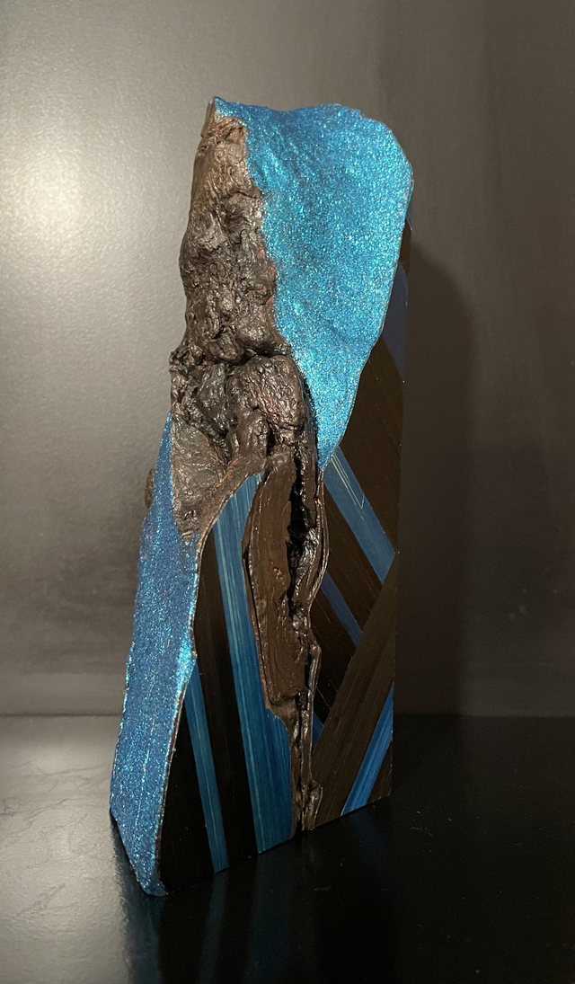 Motif : assemblage fétus noir et bleu avec pailletage couleur bleue brillant vernis